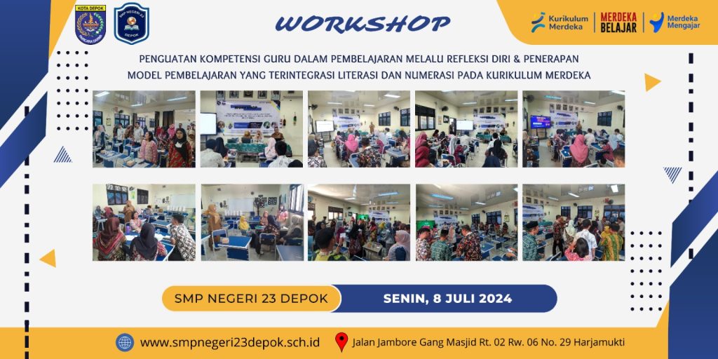 Depok (SMPN 23 Depok) – Dalam rangka persiapan menyambut tahun ajaran baru 2024/2025, SMP Negeri 23 Depok terus berbenah untuk meningkatkan kualitas pembelajaran. Salah satu upaya yang dilakukan yaitu dengan mengadakan workshop penguatan kompetensi guru melalui refleksi diri dan model pembelajaran yang terintegrasi literasi dan numerasi pada kurikulum merdeka dalam menyikapi desain kurikulum yang sesuai dengan kebutuhan zaman. Kegiatan workshop berlangsung selama dua hari, yaitu hari Senin dan Selasa (8-9/7/2024) di Aula SMP Negeri 23 Depok.